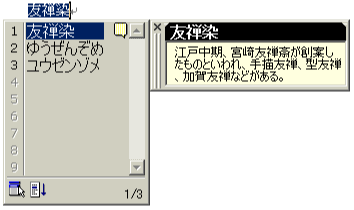 | ワープロソフトを起動しましょう。「ゆうぜんぞめ」と入力してみましょう。 一発で表示された場合はENTERキーを押して確定しますが、この時 スペースキー(変換)を押してみましょう。「友禅染」の漢字の横に 吹出がありますね?↓や↑ボタンで吹出のある着物用語に合わせて しばらくすると右側に友禅染についての簡単なコメントが表示されます。 (この吹出は同音異義語などで、どの漢字を使ったらいいかを調べる 時便利なのですが、着物用語にあまり同音異義語はないので意味や 説明を表示したほうが便利なのでした!) この機能はコメント表示ができるIME2000(以上)でないと使えません。 (IME2002は???) IME97や98はコメント表示できません。 また、全ての用語にコメントが付くわけではありません。 |