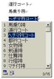 | 次は着物名ショートカット機能?です。 Z X と入力し変換してみてください。色々な種類の着物名が表示されましたね? IMEの学習機能を特にいじっていなければ、最近ZXで変換し確定した単語が 変換候補の上位に必ず来ているはずです。ですので連続して同じ着物名を入力する 時など便利な機能だと思います。ただ最初だけZXで変換し目的の着物名を探すのが 面倒ですが・・・・(1つの着物名だけだったらコピー&貼り付けが速いですが、1〜9 以内の候補を比較的早く変換できる点ではこちらのほうが便利だと思います。) |