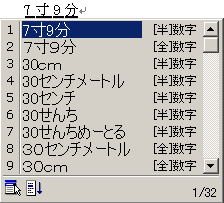 | 最後に寸法変換機能を紹介します。 これはどちらかというと仕立て屋さんが使うと便利ではないでしょうか? 30cm と入力し、変換してみましょう。7寸9分が変換候補に表示されます。 このように1cm〜189cmまで1cmきざみで寸法に変換できます。いっぽう 今の所きりのいい数字だけですが寸法→cm(m)変換もわずかながら 出来ます。 1しゃく と入力し、変換してみてください。37.88cmと変換候補 に表示されます。 変換された数字には多少の誤差があります。これは地方で若干違うようです。 例えばこのIME辞書では1cmを2分6厘としていますが2分5厘とするところも あるようです。ですのでこの変換で出た寸法は目安としての数字と認識する のが良いと思います。くれぐれも微妙な寸法で仕立をする時などの変換に 使わないでください。 |